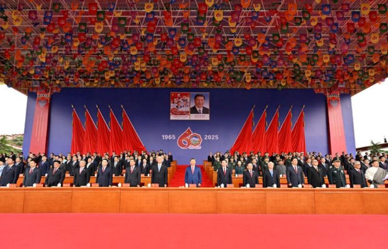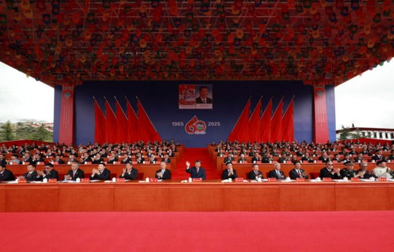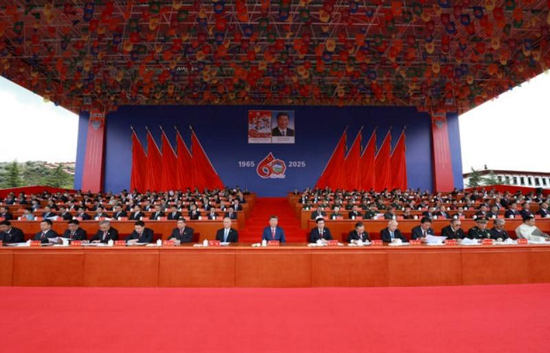 王沪宁发表讲话。他说,1965年9月,在党中央亲切关怀和党的民族政策光辉照耀下,西藏自治区宣告成立。这是西藏发展史上具有划时代意义的大事,巩固了西藏和平解放和民主改革的伟大成果,实现了西藏社会制度的历史性跨越。60年来,西藏经济社会全面发展,民族区域自治制度成功实践,民族团结日益巩固,各族人民生活蒸蒸日上,充分展现了中国共产党领导的坚强力量,充分展现了我国社会主义制度的显著政治优势。