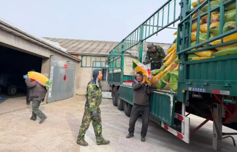 在共和村双喜现代农机合作社,农民们正忙着将成袋的化肥从运输车上卸下,分类码放在仓库内,现场一派繁忙景象。