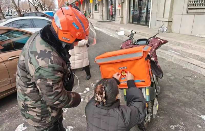 活动现场,工作人员与外卖骑手亲切交流,关切询问大家的工作和生活情况,对骑手们在寒冬腊月坚守岗位、服务群众的辛勤付出表示衷心感谢和崇高敬意。随后,工作人员将热气腾腾的暖心饺子送到骑手手中,将喜庆的“福”字精心贴在电动车上,并叮嘱大家在忙碌奔波中一定要注意安全,做好防寒保暖。