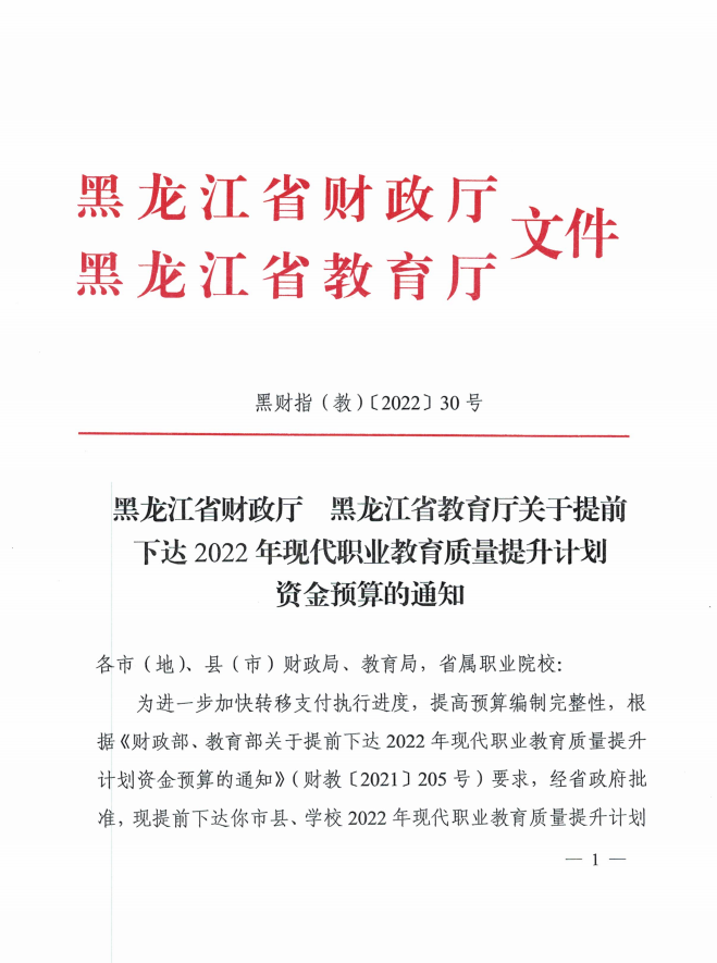 关于提前下达2022年现代职业教育质量提升计划资金预算的通知---黑财指(教)【2022】30号.zip