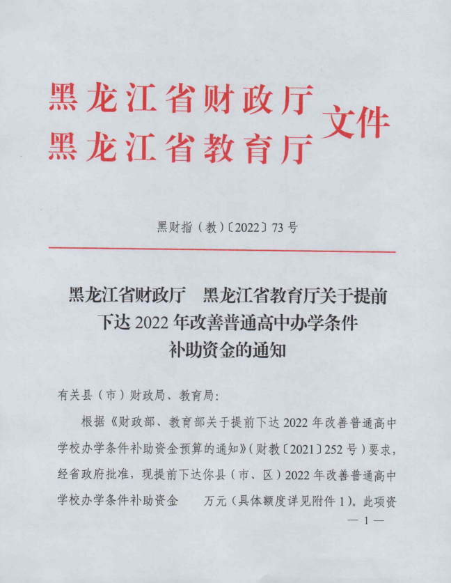 黑龙江省财政厅 黑龙江省教育厅关于提前下达2022年改善普通高中办学条件补助资金的通知.rar
