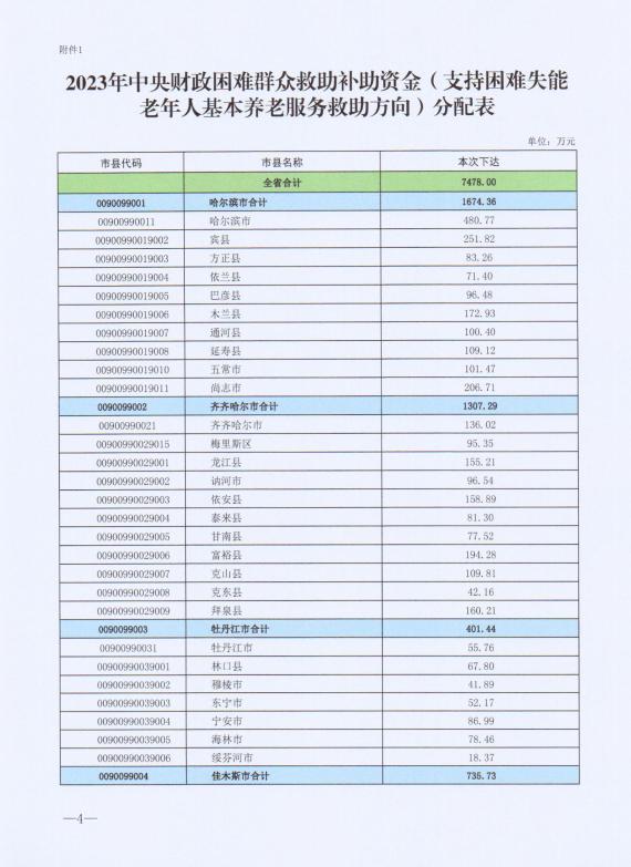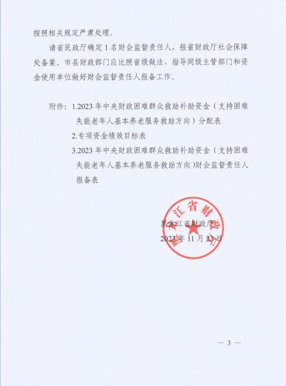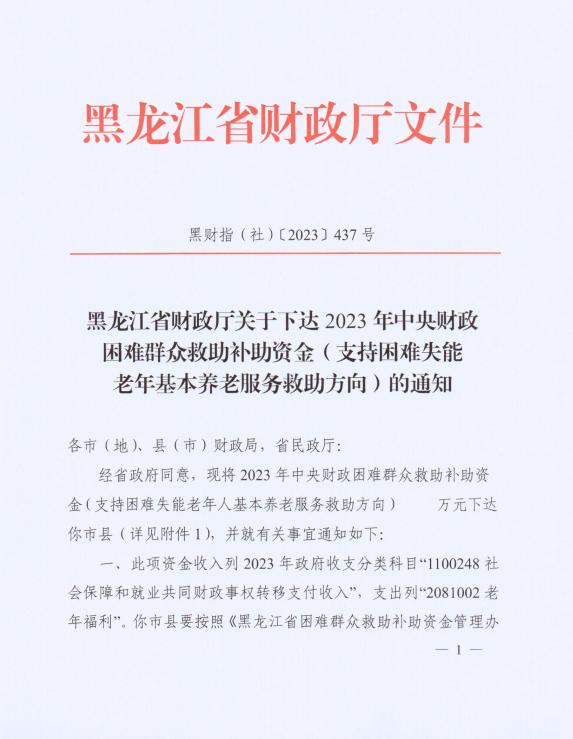 【黑财指(社)〔2023〕437】黑龙江省财政厅关于下达2023年中央财政困难群众救助补助资金(支持困难失能老年人基本养老服务救助方向)的通知.pdf