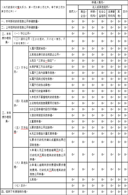 自《中华人民共和国政府信息公开条例》正式实施至本年度末,本单位未收到当面申请、网站提交、电子邮件、传真、信函和其他形式的政府信息公开申请。