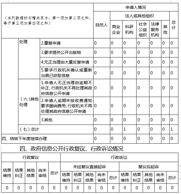 2021年度共受理政府信息公开申请1件。按照《中华人民共和国政府信息公开条例》不予公开的政府信息1件。本年度没有发生有关政府信息公开事务的行政复议、行政诉讼案。本年度没有发生有关政府信息公开收费情况。